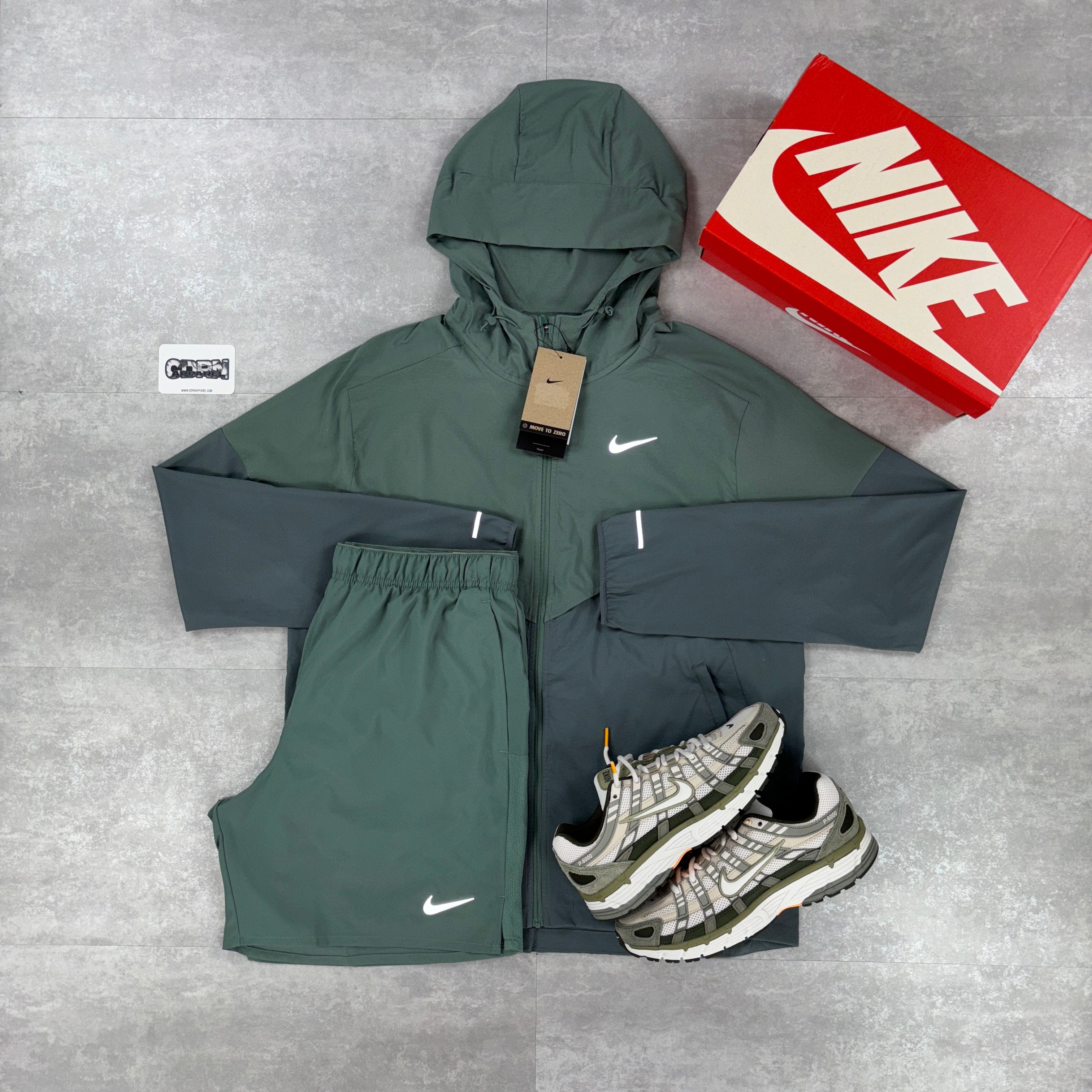 Here we have the Clay Green / Smoke Grey Nike UV windbreaker and Clay Green Challenger shorts set.